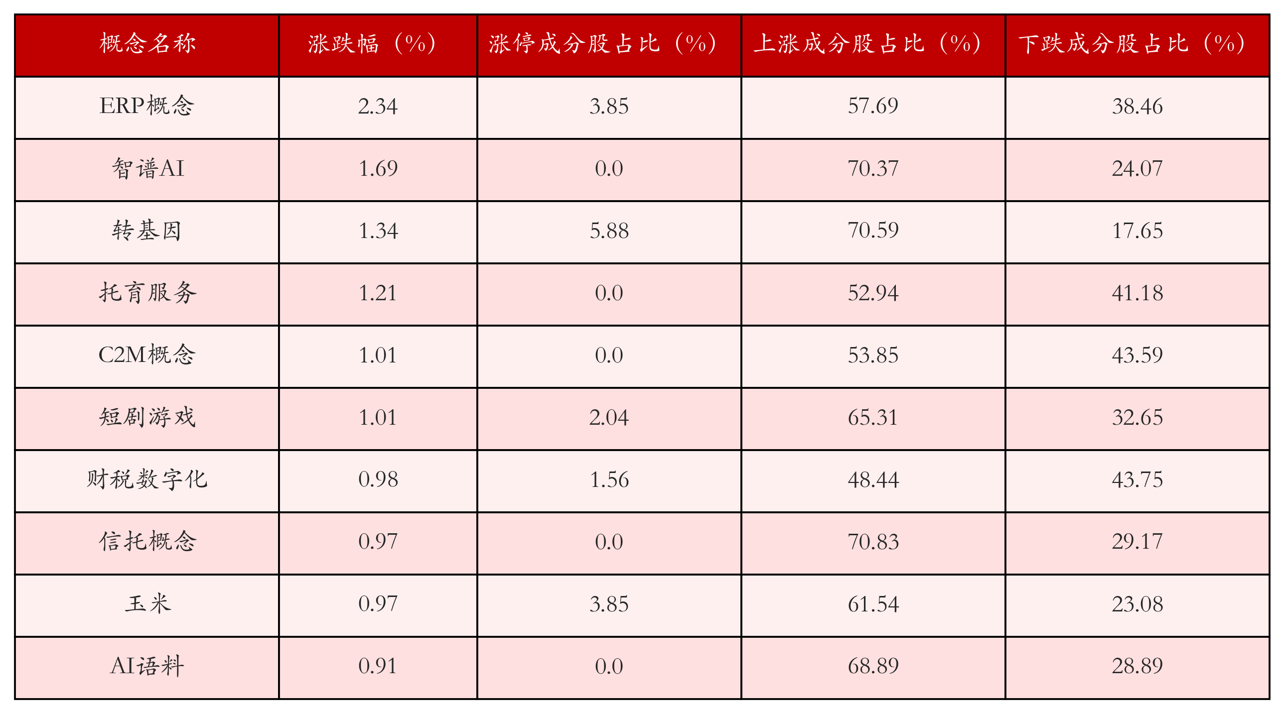 根据A股概念涨跌幅与所对应的股票池综合分析,涨幅靠前的三个概念板块分别为:ERP概念、智谱AI与转基因。排名前10位的概念板块相关数据见下表: