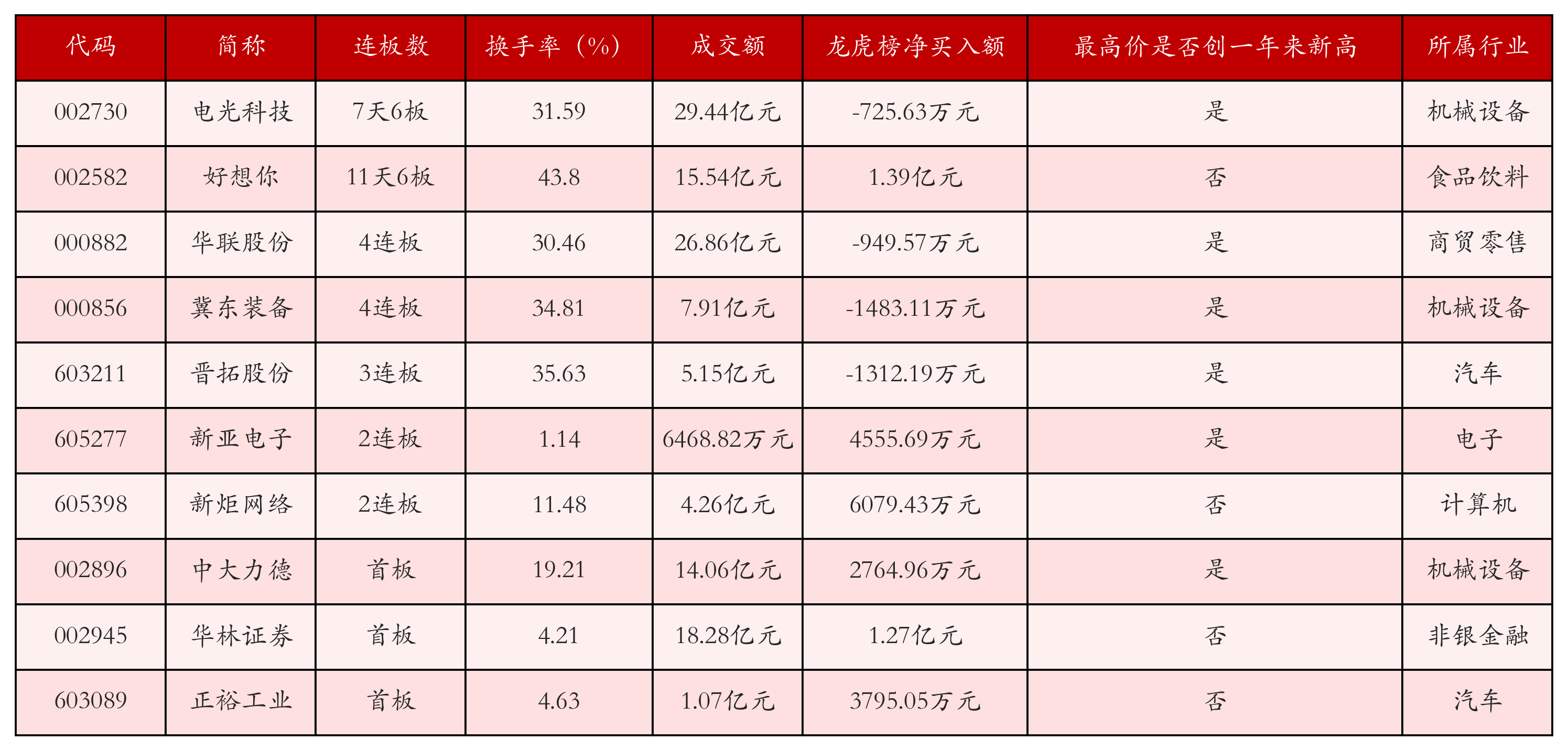 一、强势个股截至1月23日收盘,上证综指上涨0.51%,收于3230.16点,深证成指下跌0.49%,收于10176.17点,创业板指下跌0.37%,收于2093.31点。今日沪深两市A股共计46只涨停,综合当前连板数以及当日龙虎榜数据,其中较为强势的前三只个股分别为:电光科技(002730)、好想你(002582)与华联股份(000882)。今日强势个股前10位具体数据见下表: